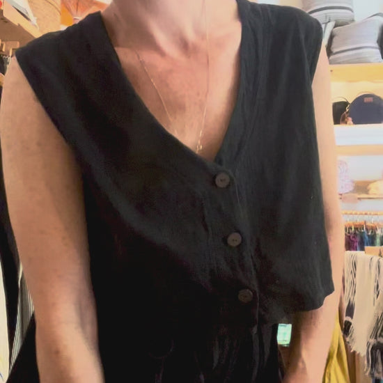 Our own, Dear Friend, boxy top that can be worn 3 ways. Rock this top as a v-neck button up, reversed for high neck in front with button details at back, or open as a casual vest. Because variety is the spice of life!